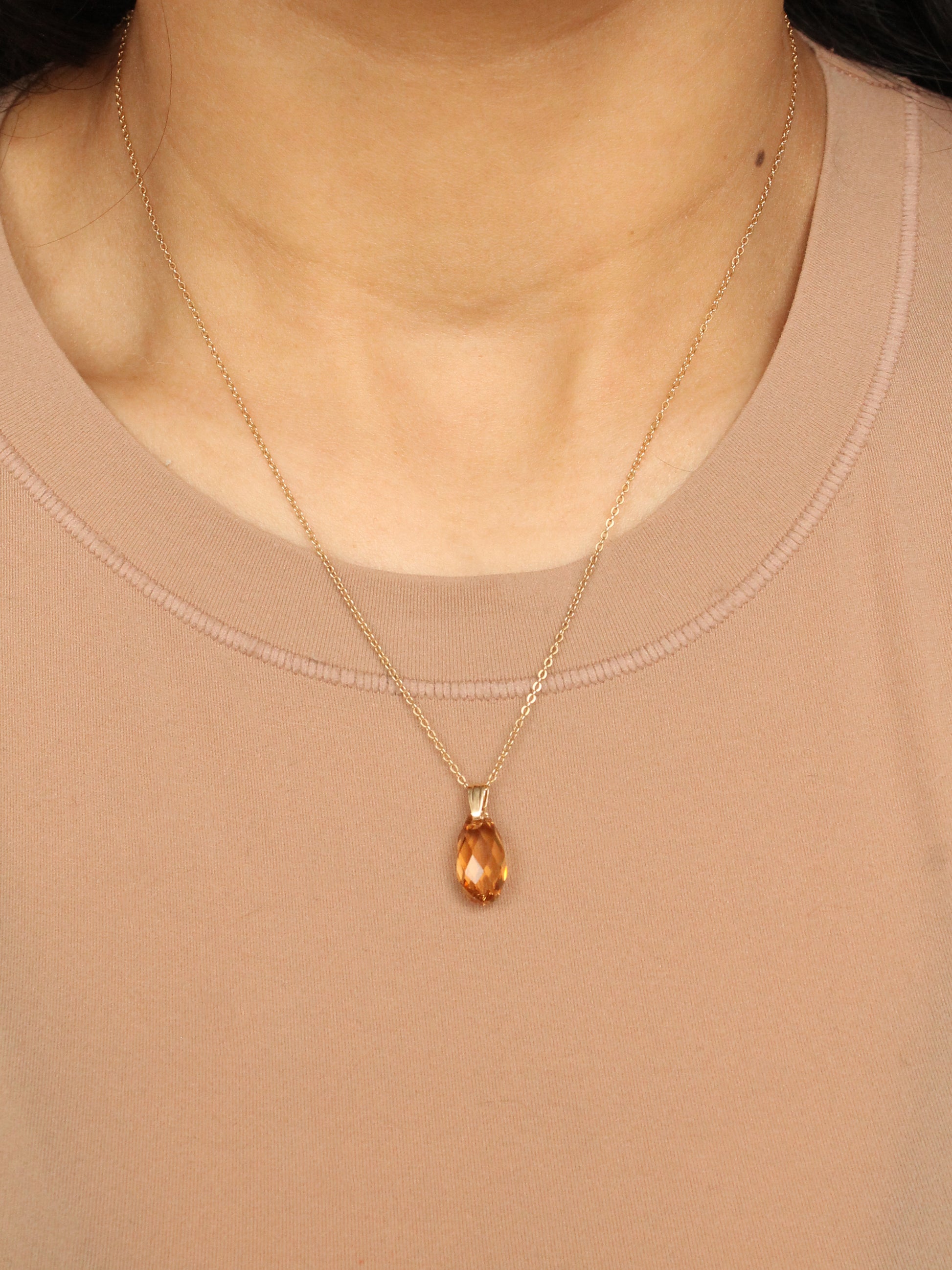 Stunning crystal pendants in a topaz or light pink color with a pear-shaped, rounded checkerboard cut hanging down on a dainty gold-filled bail & cable chain.